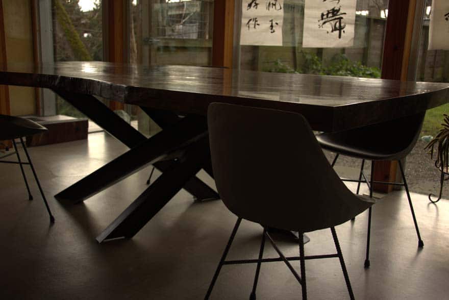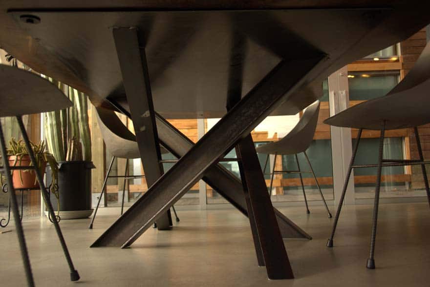I came across a general idea for a table base that we liked. I wanted it to be abstract and look like it was floating on steel I-beams. After talking to all of the local fabricators, we decided to go with Pacific Sheet Metal James and his team had designed and fabricated some really nice pieces, and they were only 1/2 mile from our house. PSM created the shop drawings based on the specs of the table top size/weight and the design elements I was desiring to achieve. We came up with the idea to use a 4″ #7.7 locally sourced I-Beam and place a steel plate on the top with holes for mounting that would allow the slab to expand and contract over time. The table base came out at roughly 200lbs and it took 4 of us to move into the house. It was delivered in raw steel with most of the natural rust left in place. For the finish, we coated it in Carnauba wax.