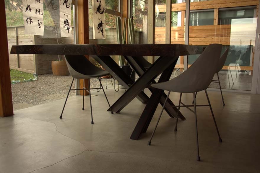 After lots of research, my wife really liked the Herman Miller Eames style of chairs. I eventually found a French artist group Lyon Benton that created a rebar based concrete chair called the HAUTEVILLE in a famous 50’s design ( Eames). No plastic or fiberglass in these chairs! They are Heavy but rather comfortable and warm up the longer you sit in them.