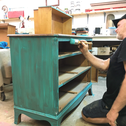 We began by lightly sanding the entire surface — top, bottom and sides, to improve the adhesion of our Caribbean Blue paint to our dresser’s surface. Because our environmentally friendly Real Milk Paint offers a matte, velvety finish, we knew it would look striking when applied to the antique wood of this dresser.