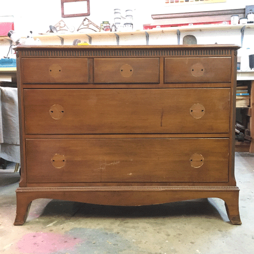 As with so many other DIY projects, the difference is in the details. When the major paint and sealing work was complete, Dwayne from our RMP team used a bit of dark brown soft on the delicate border etchings of this dresser for a distressed look. White soft wax was also used on the flower accents to highlight these details.