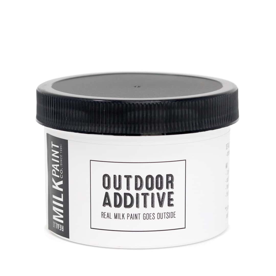 “Outdoor Additive” by The Real Milk Paint Company is an exterior paint additive made with borate compound, similar to borax. Borax can be found at the grocery store as Twenty Mule Laundry Booster. It is mined from the ground mainly in California. Borax is safe and non-toxic and has multiple uses. “Outdoor Additive” is a slightly modified borax compound that is very finely milled, so that when added to the painting furniture project it remains smooth.